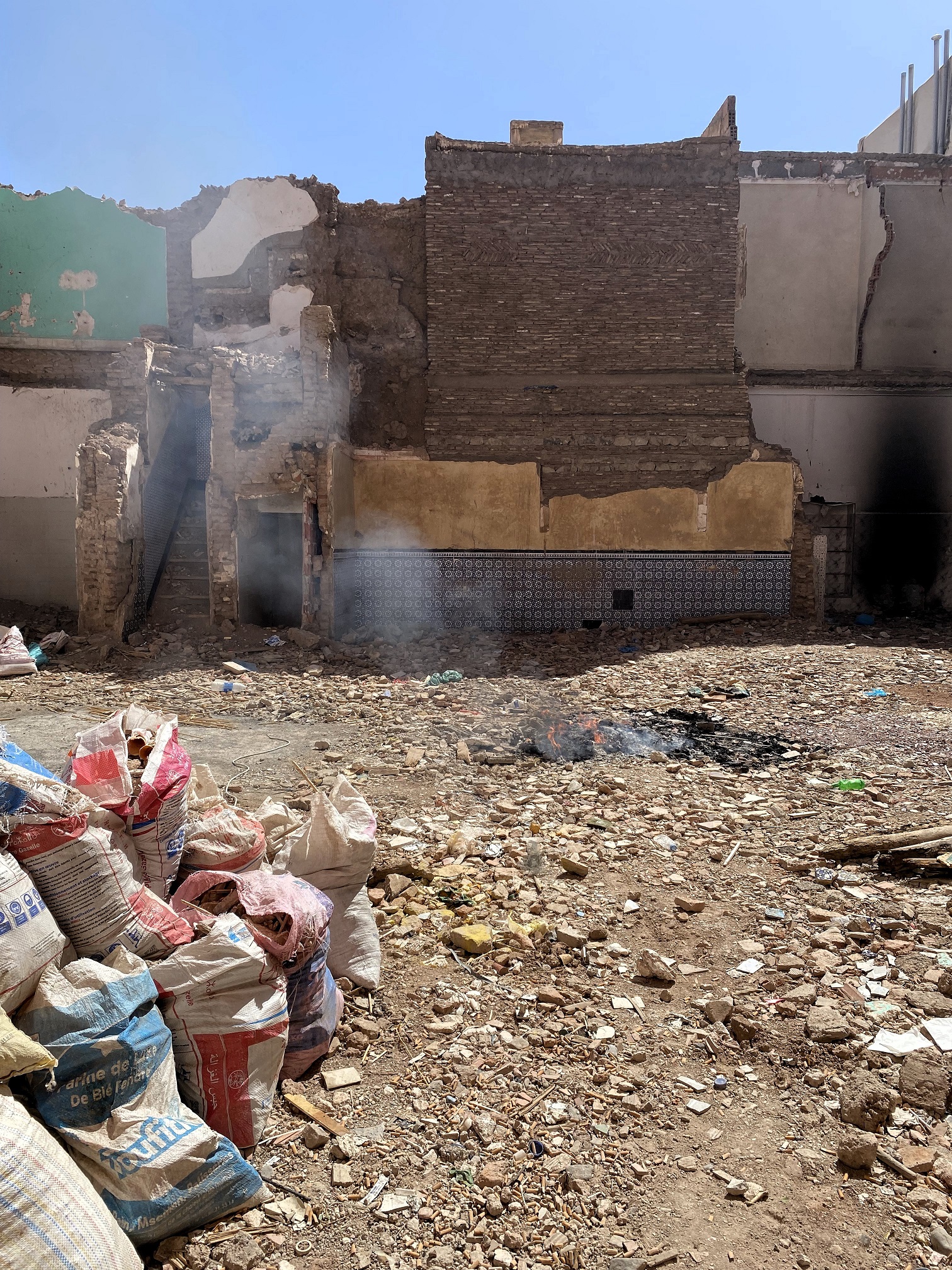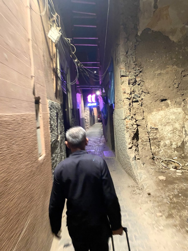 But the driver did eventually appear and I was whisked into the streets of Marrakesh. Until I wasn’t. In the dead of night (okay, it was like 10pm, but it was really dark), he pulled into a sketchy alley and parked in front of chain link fence. The fence was unsuccessfully attempting to keep passerby’s out of a collapsed building/heap of rubble (thanks to the 2023 earthquake, we saw lots of this). English was certainly not happening with this driver, and my anxiety started to rise as I listened to him make an interesting phone call to a woman who sounded suspiciously like a girlfriend. Why are we parked here? Why is he making a booty call right now? Where is the Riad? Is now when I get out my phone and start recording because it might be my last proof of life? WTF is going on?!