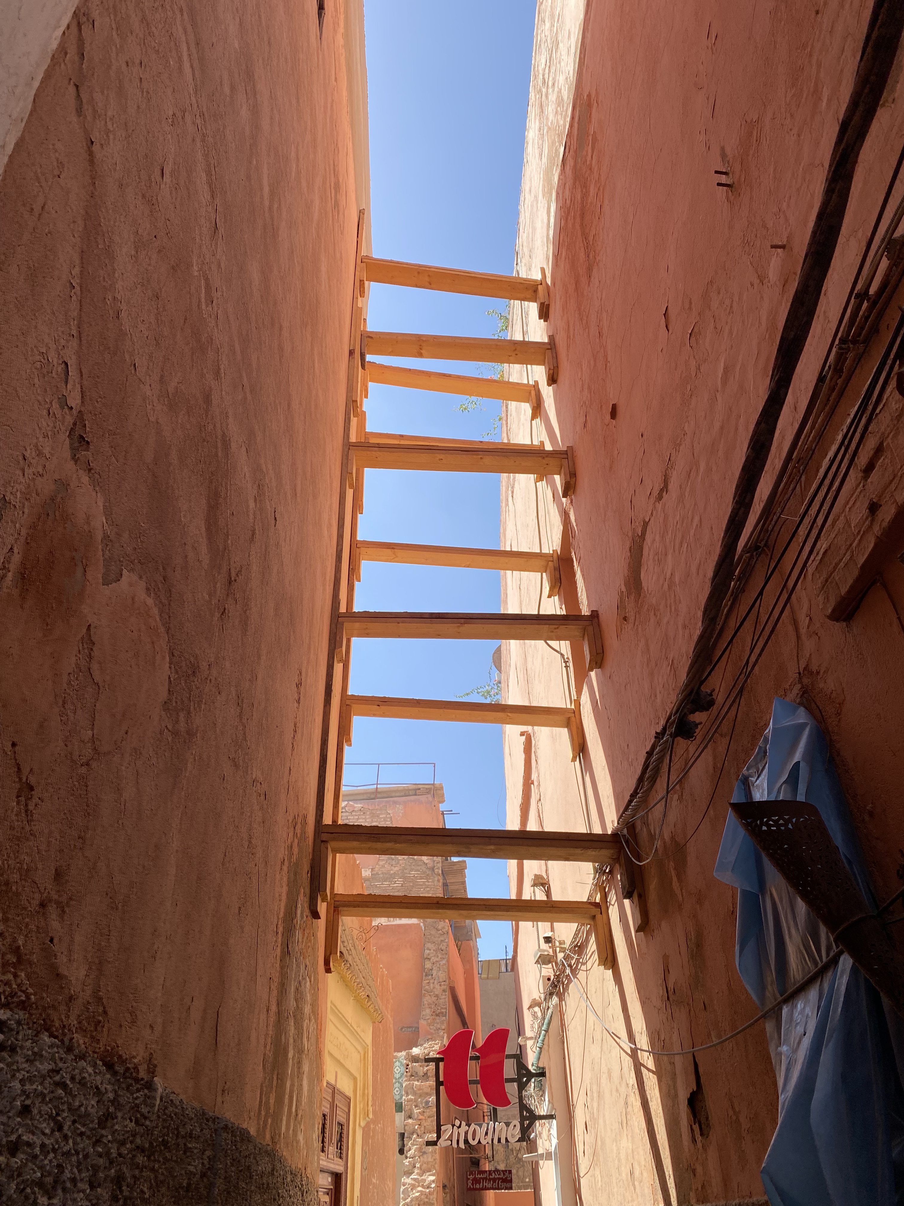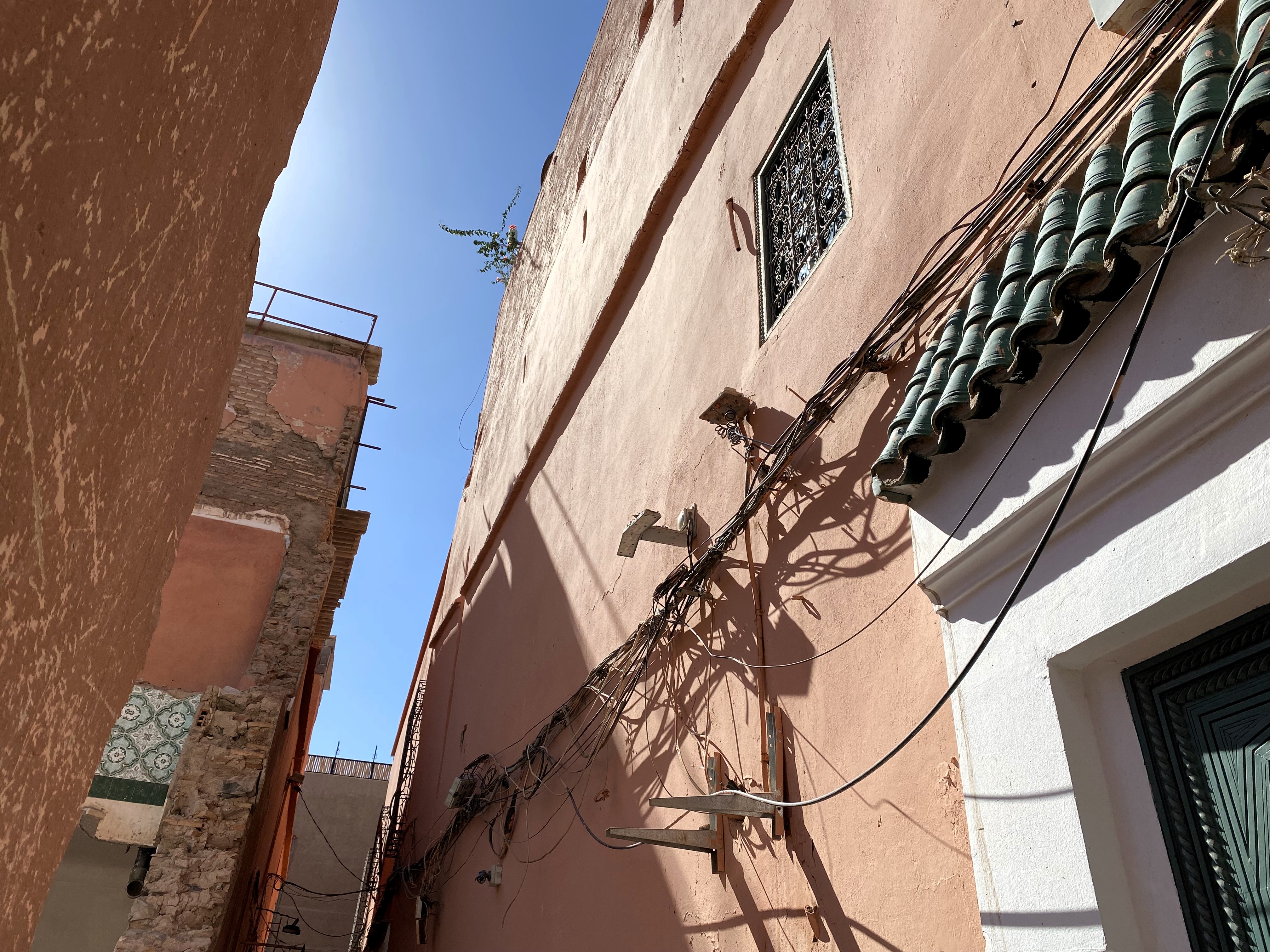 Then, I saw a sign for our Riad. I felt (a tiny bit) of relief. The sign was neon pink and surrounded by rubble and electrical cords. Next thought: Great, I booked us into a strip club. What in the world have I done?!