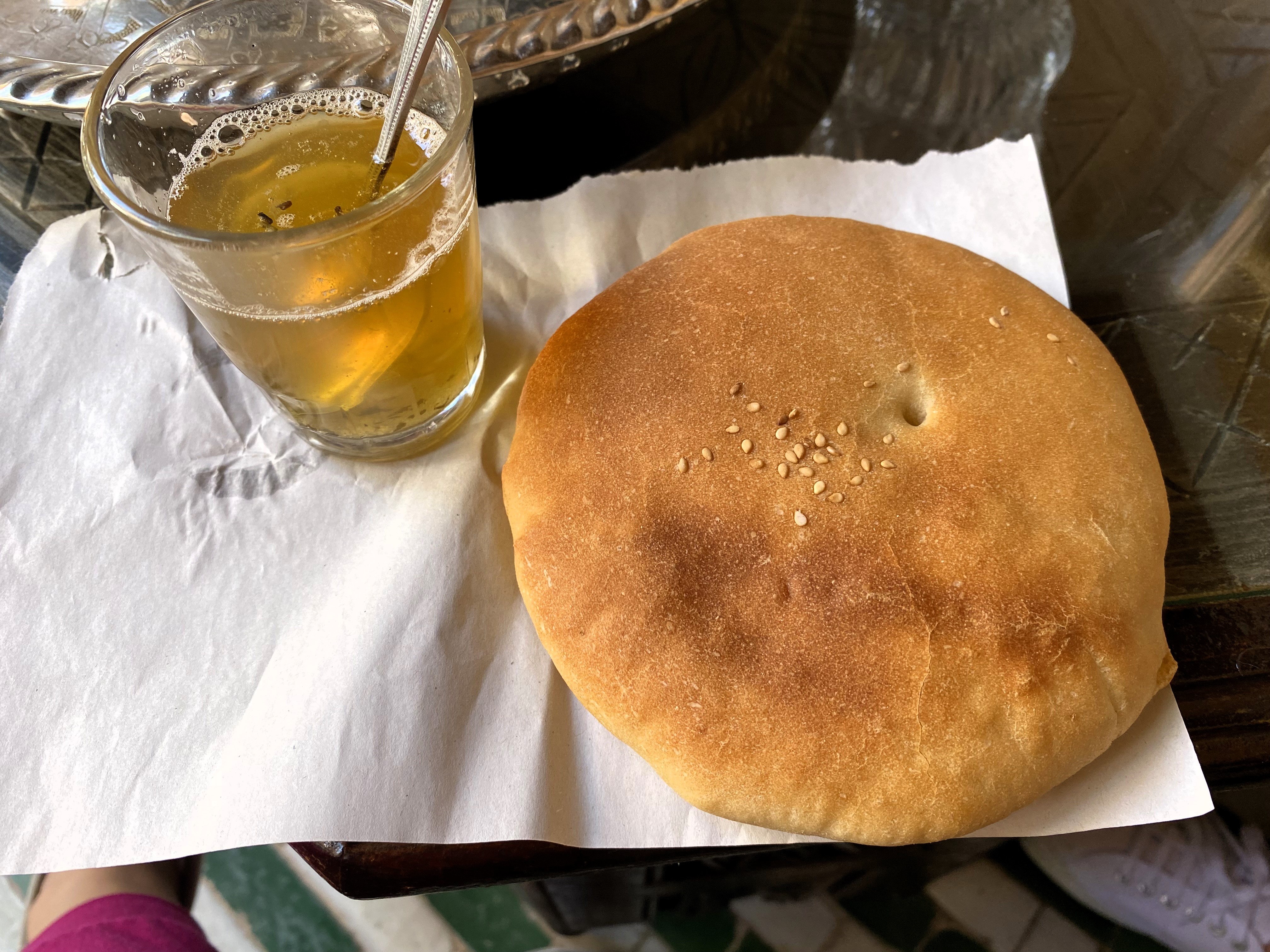 We walked across the lane and entered a beautiful courtyard. A host brought us some mint tea and we dined on tea and sweaty bread!