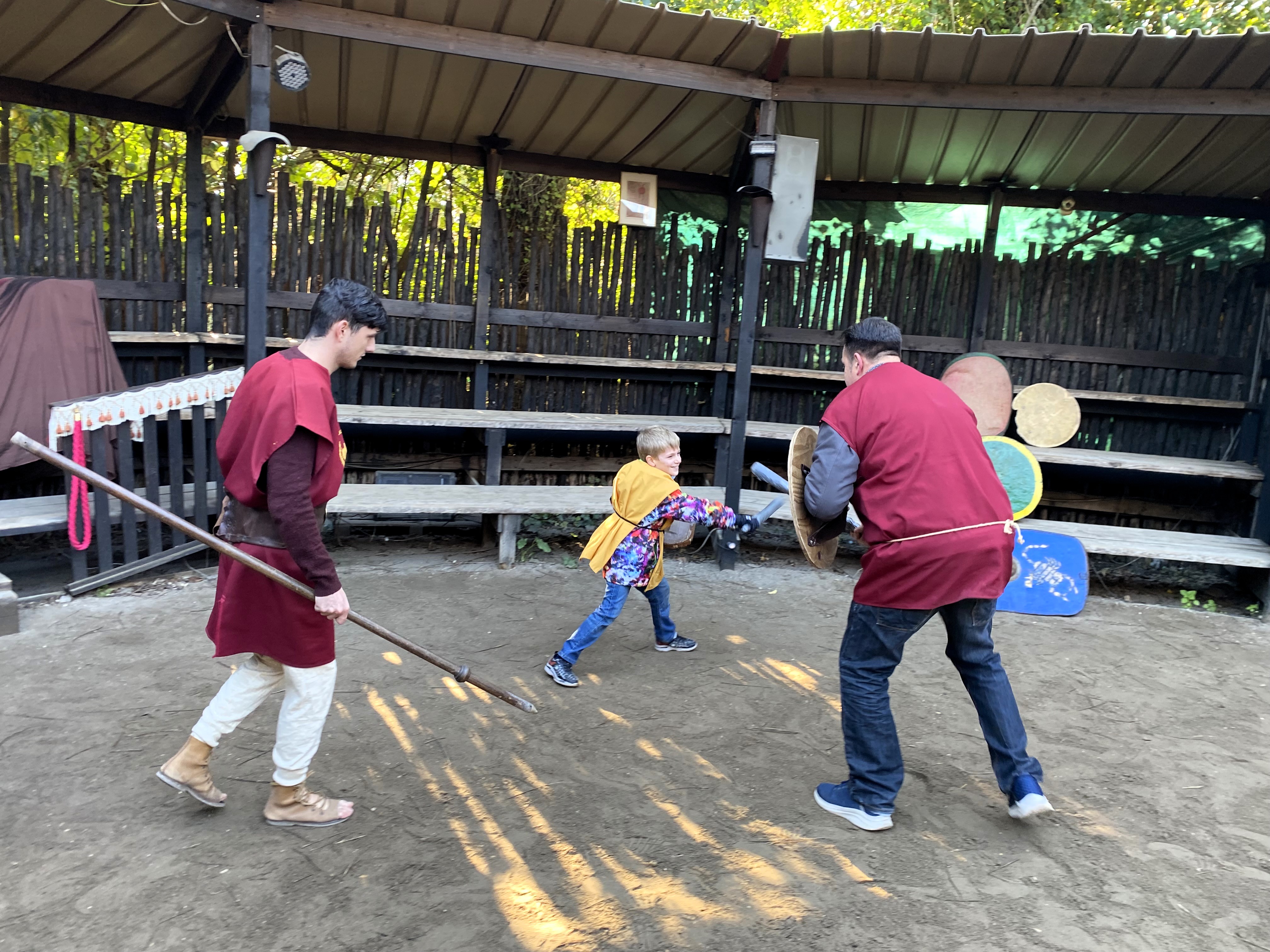 The gladiators-in-training started with an armor fitting, then some skill work! They were taught four attack maneuvers, along with corresponding defense tactics.