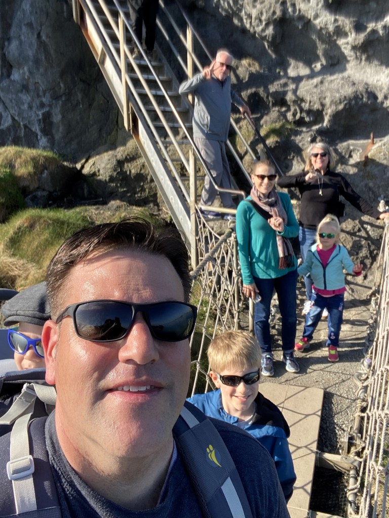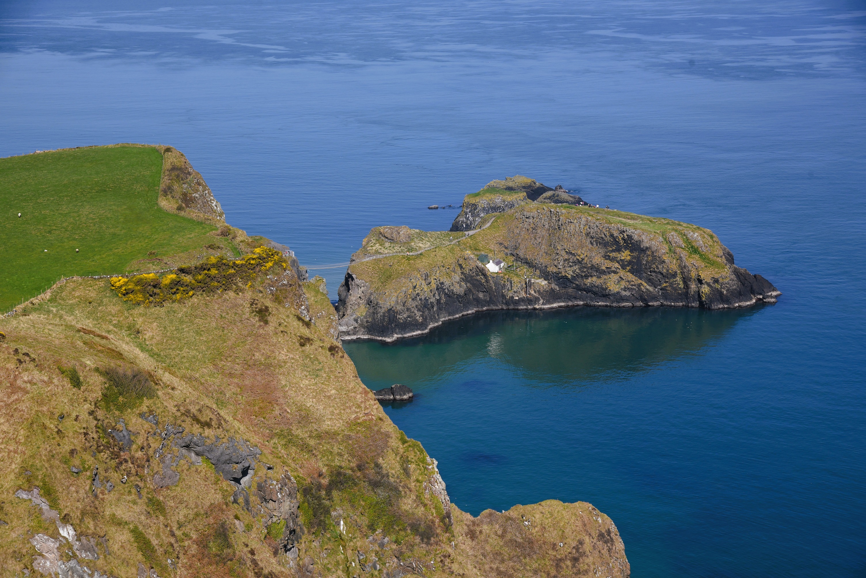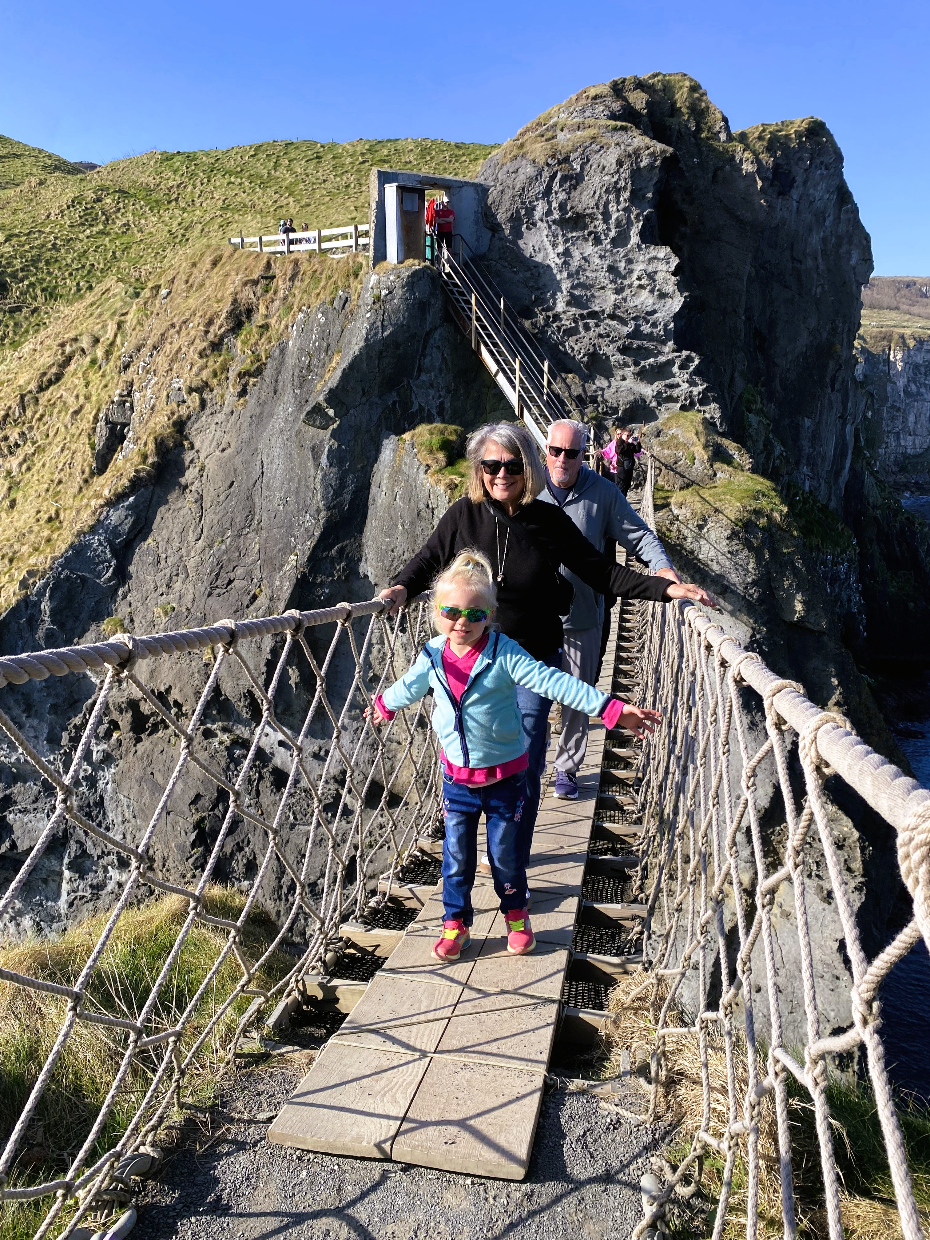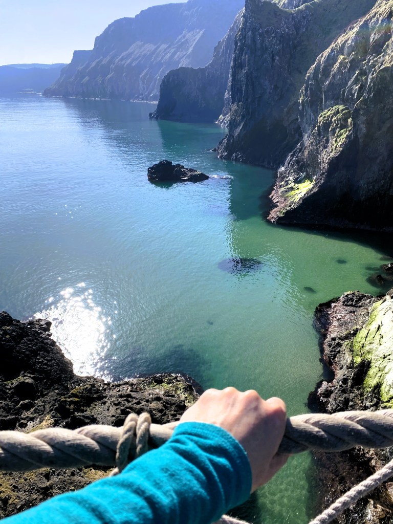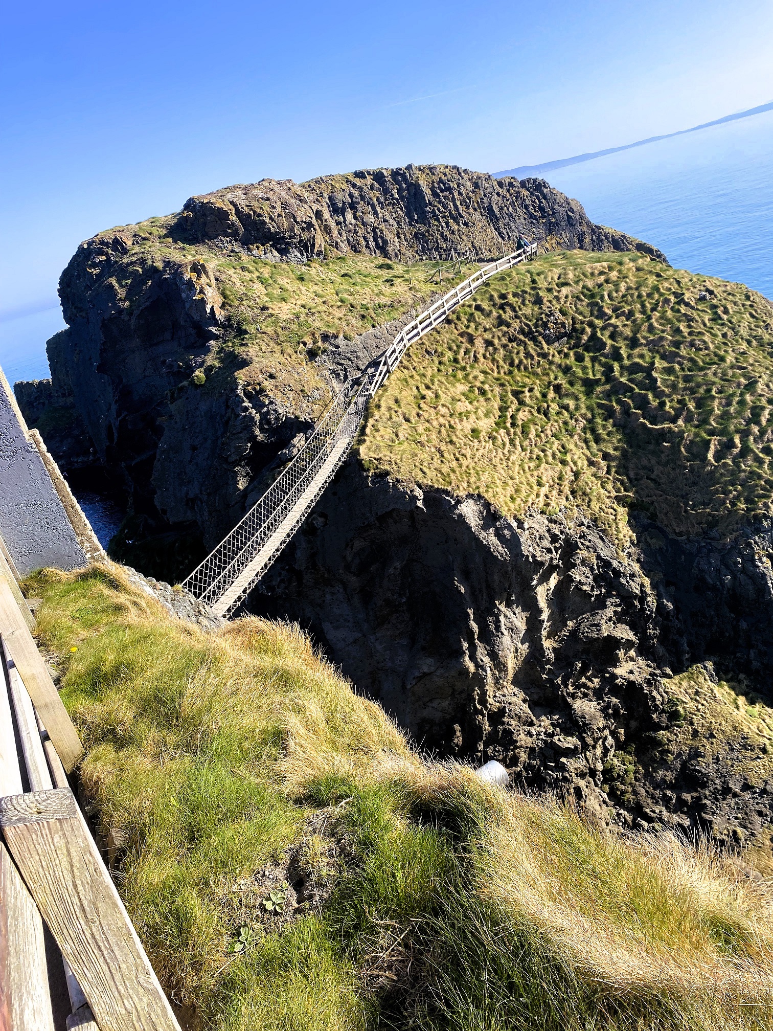 We spent the morning at Carrick-a-Rede, the rope bridge in Ballycastle. One hundred feet above the sea, the sixty-foot bridge is made of planks strung between wires. It was created in 1755, so salmon fishermen could check on their salmon nets off the island of Carrick-a-Rede. It used to be only one handrope, which the fishermen crossed daily, while carrying their catch and equipment. Since the fishery only operated in the summer, the rope bridge was dismantled every winter.