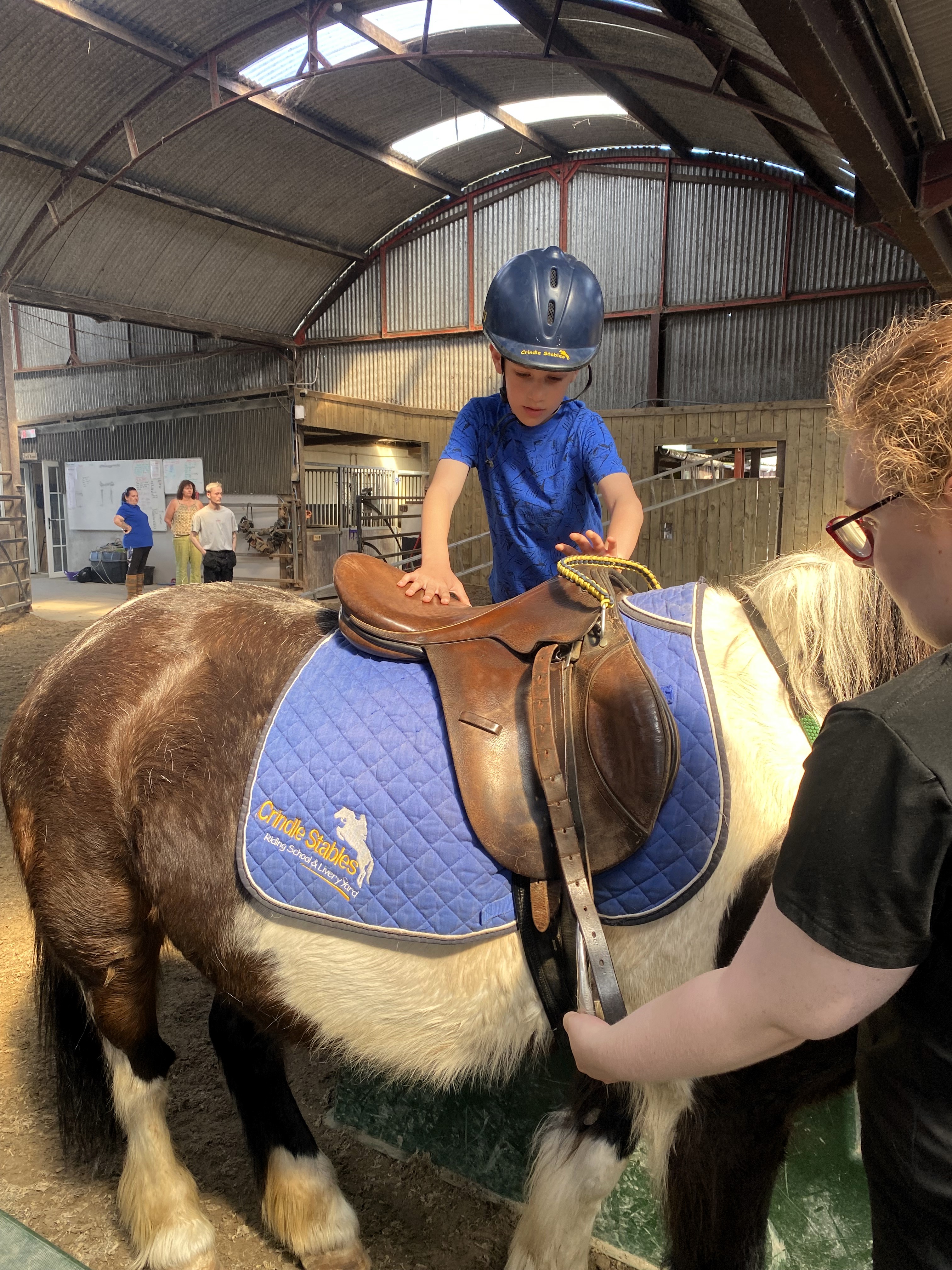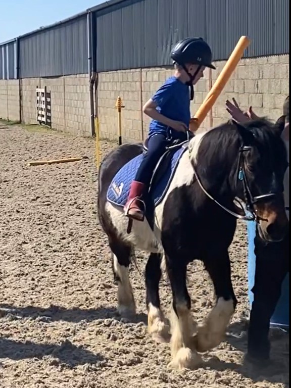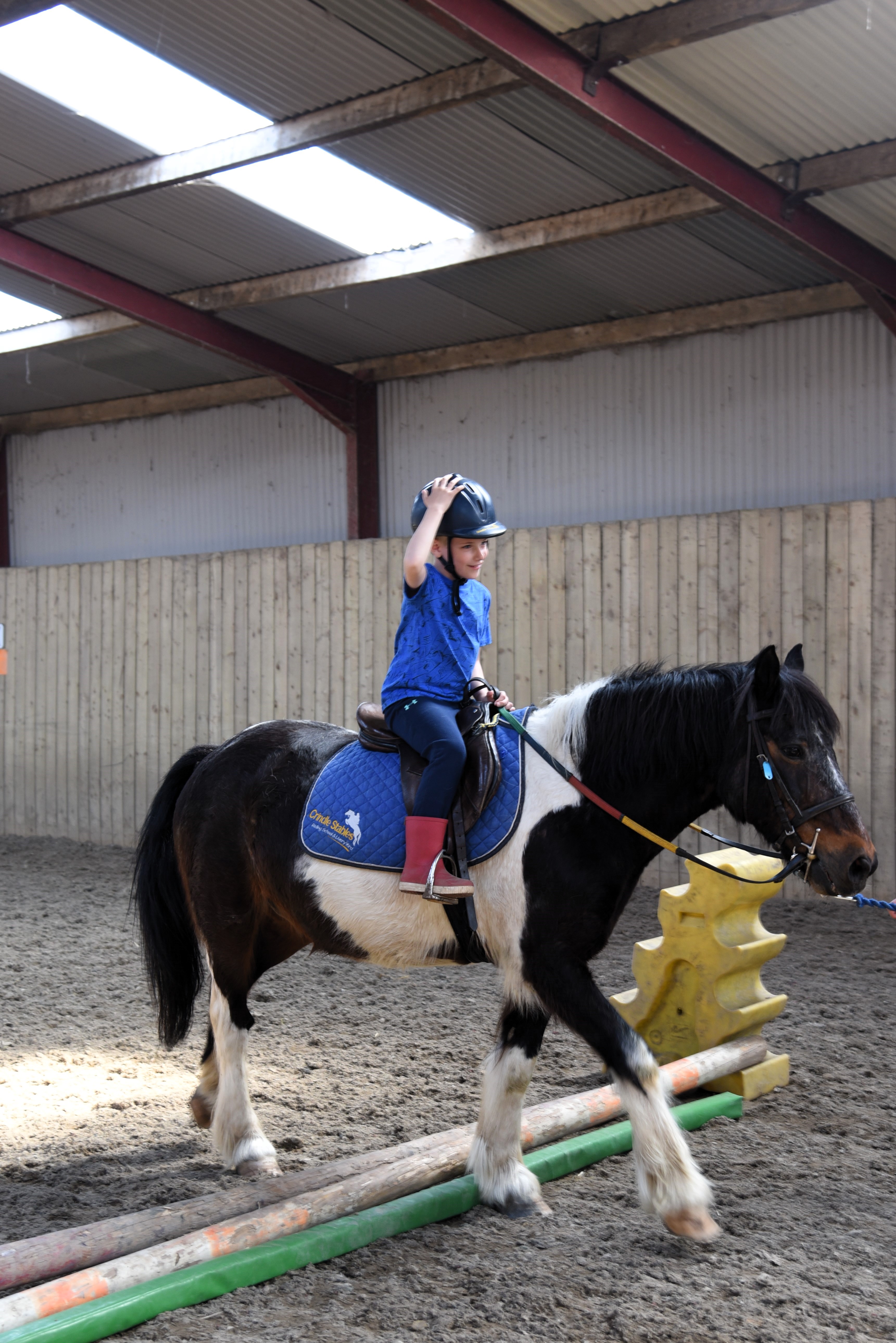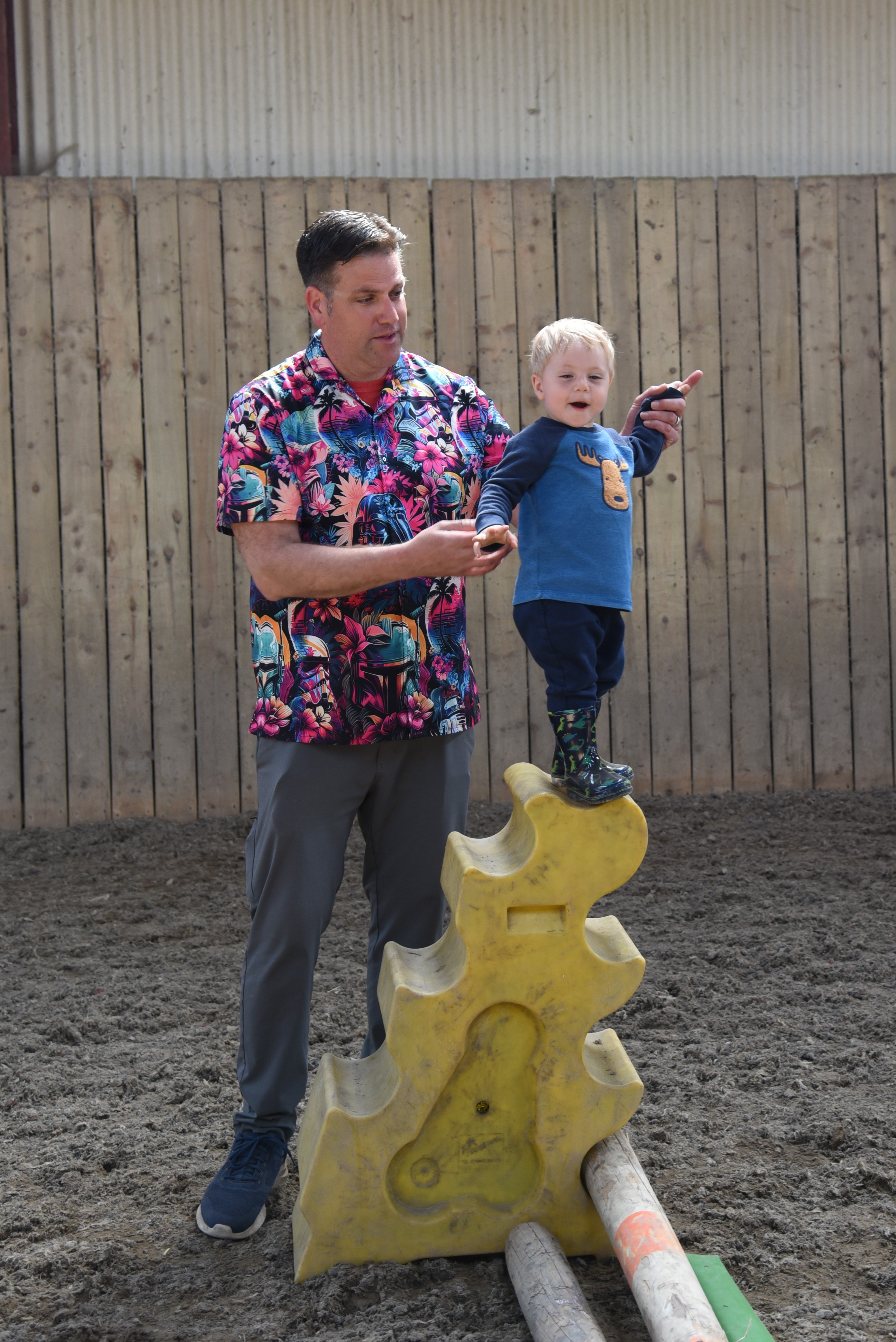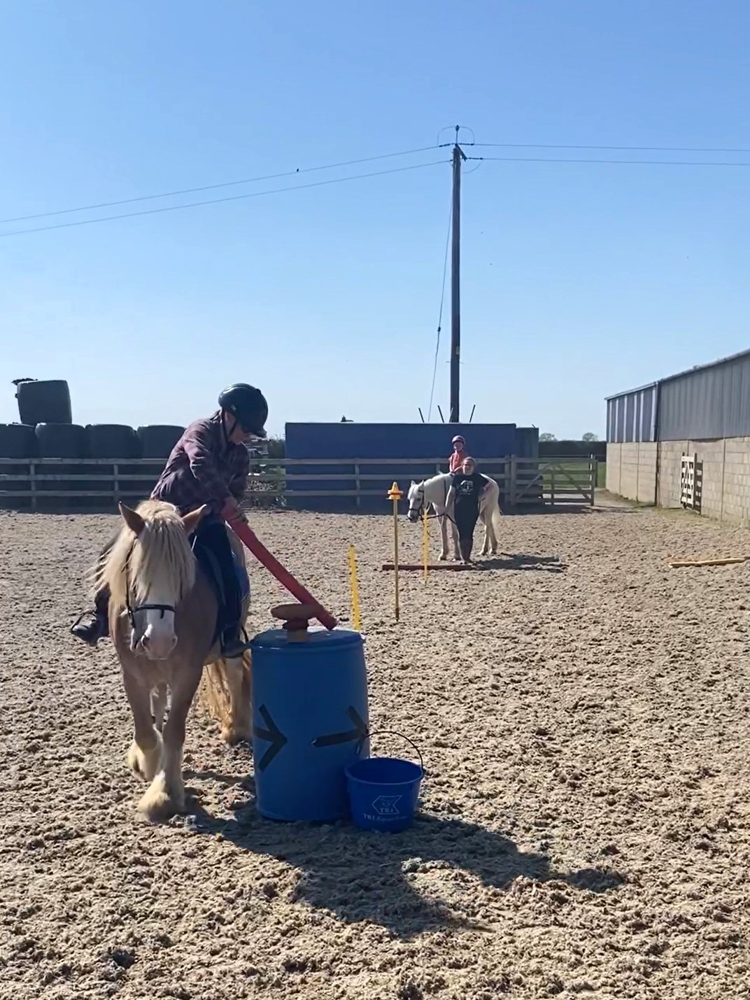 Here’s where I was offered a horse and asked if I wanted to join the games! With a resounding ‘yes!’ I tacked up and we moved outside to “jump” over some ground poles. And more games! We weaved around obstacles, tossed bean bags, and even used “swords” to hit targets (T1’s favorite!).