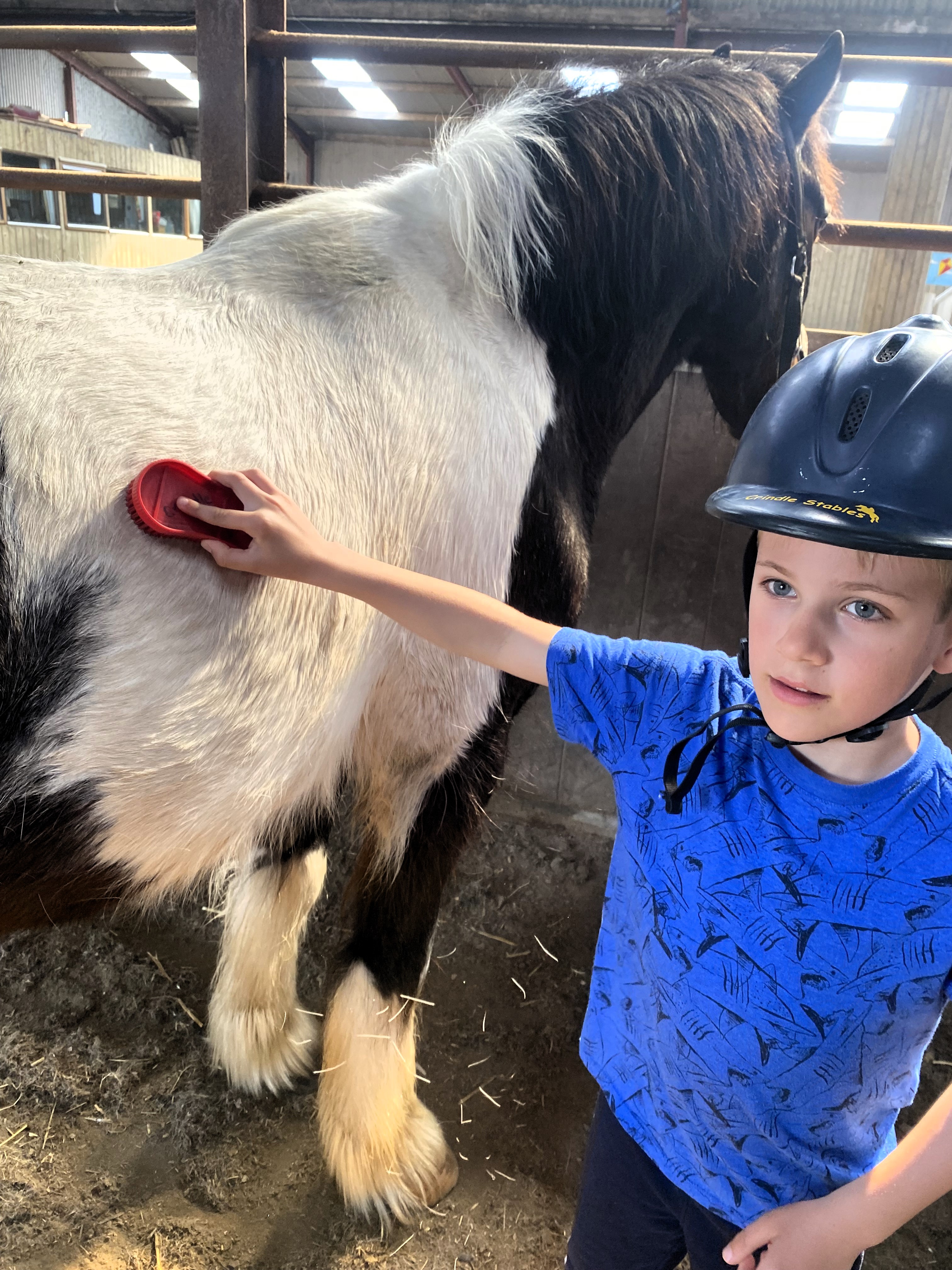 Next, the kids met their mounts and began to prep them for the day. I was grateful that they were involved in the stable management aspect of riding, instead of just climbing on. And they did great!