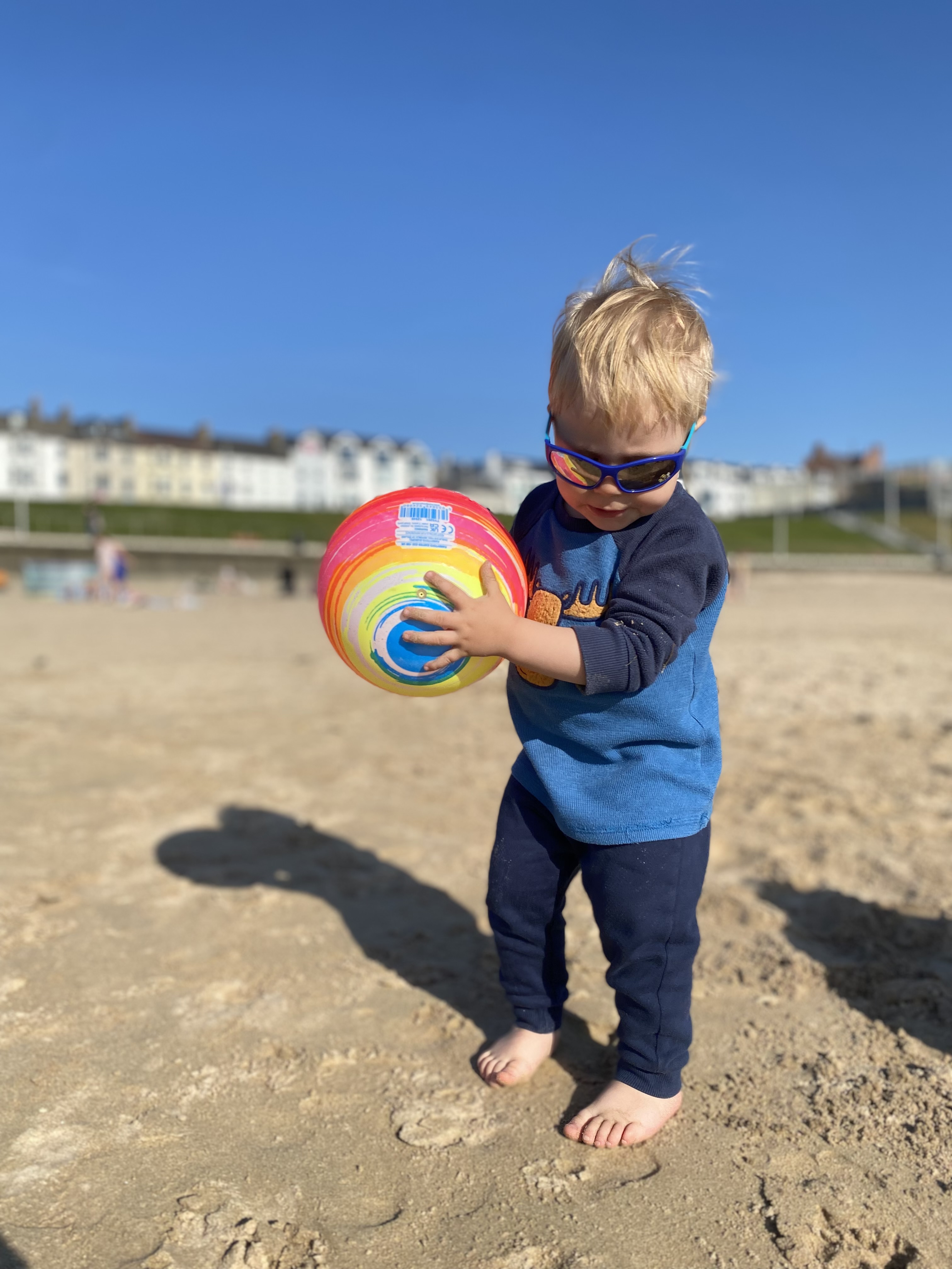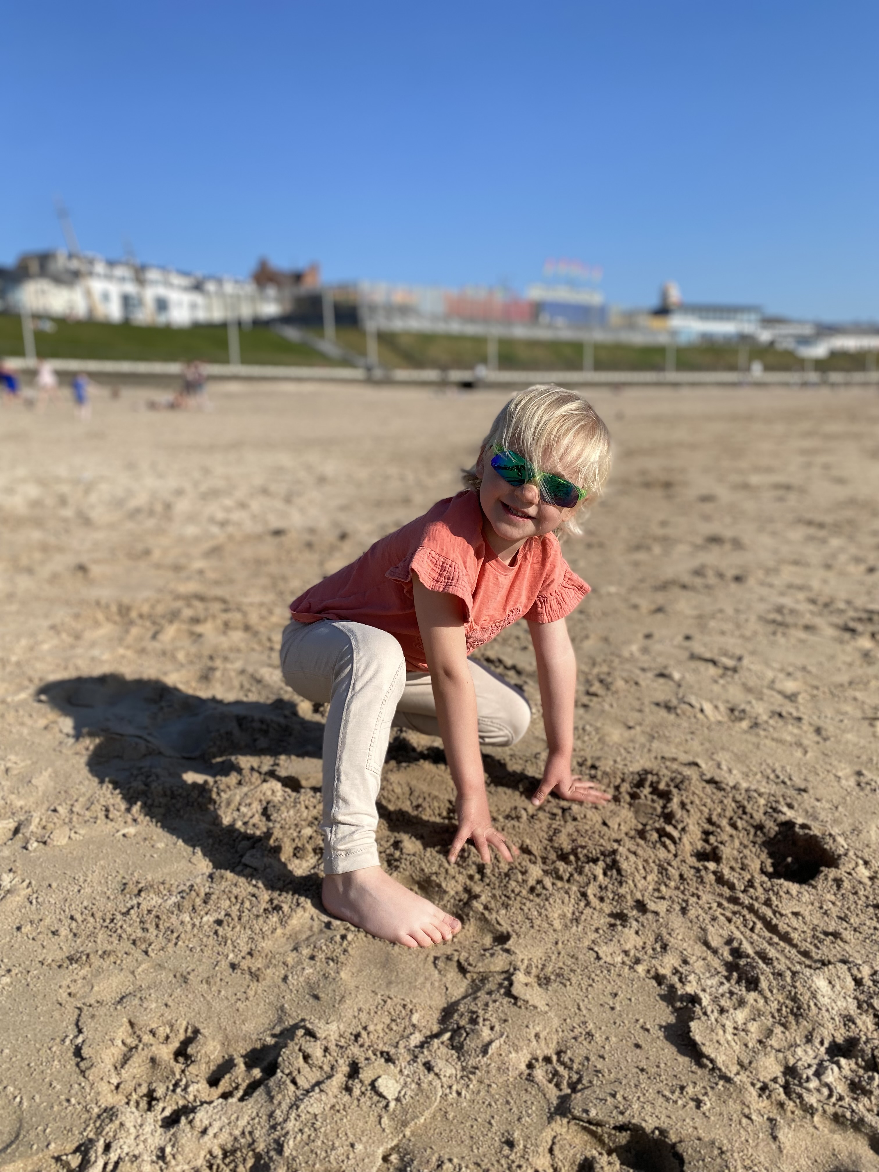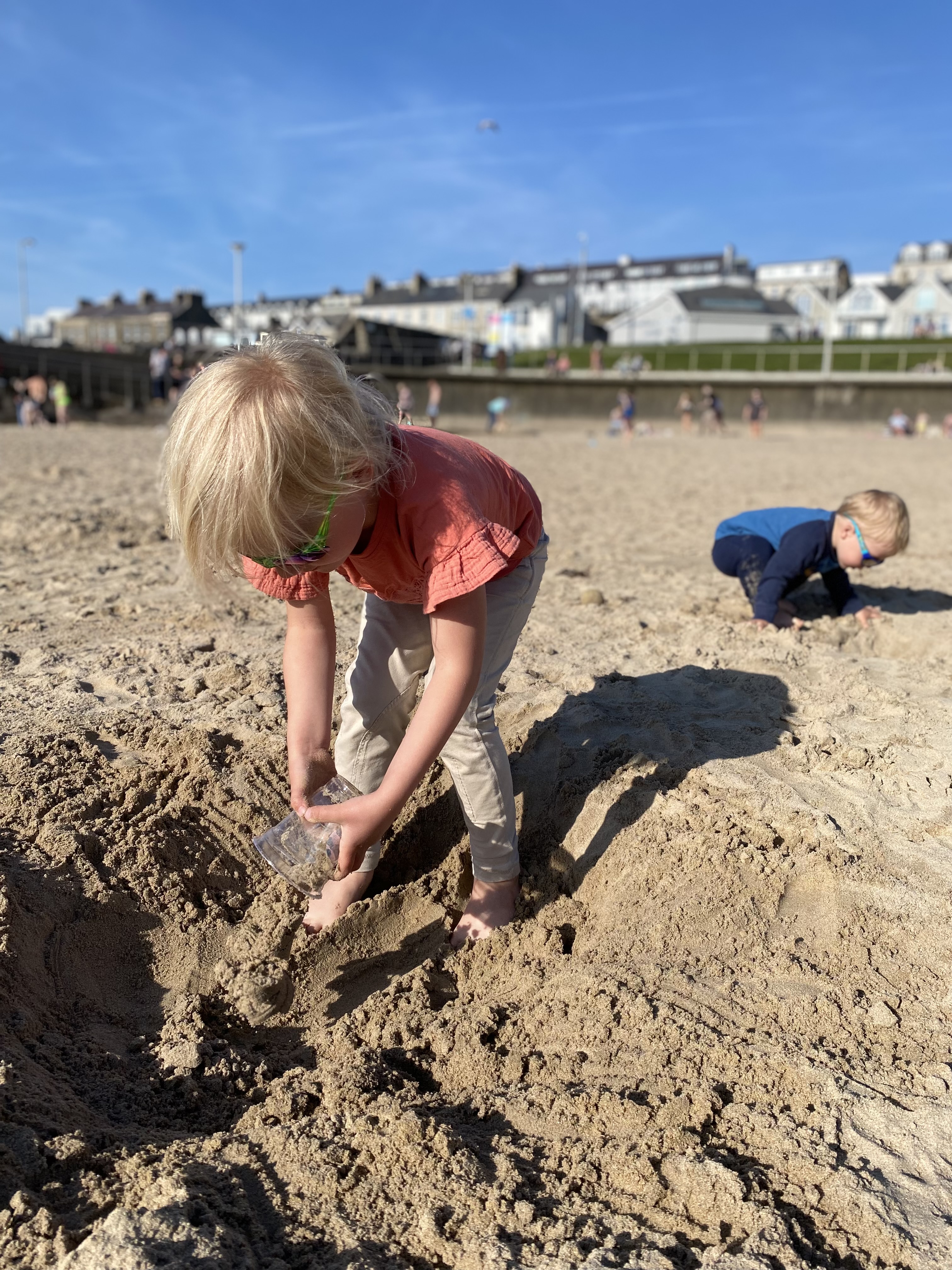 The kids did a great job! This experience lasted twice as long as I anticipated and they spent a lot of time in the saddle on a very warm day. So, we packed up and headed out for ice cream! AND, what comes naturally after ice cream? An impromptu trip to the beach!! Spontaneity with three young kids can be hard, but who needs a plan?! We had nothing: no beach toys, no towels, no flip flops. But that didn’t stop us. A very kind mom lent us a ball and our dad…well…he took one for the team and guzzled a beer so his beloved children could have a cup to dig with. What a hero.