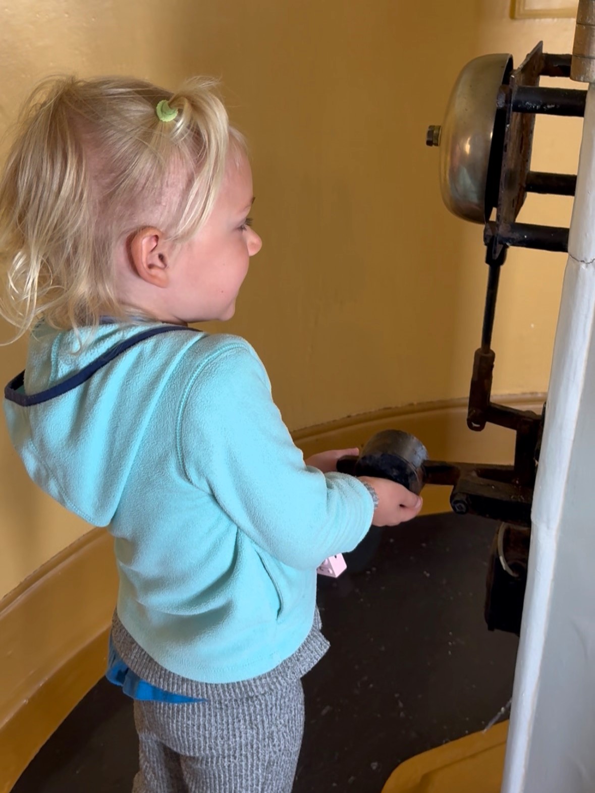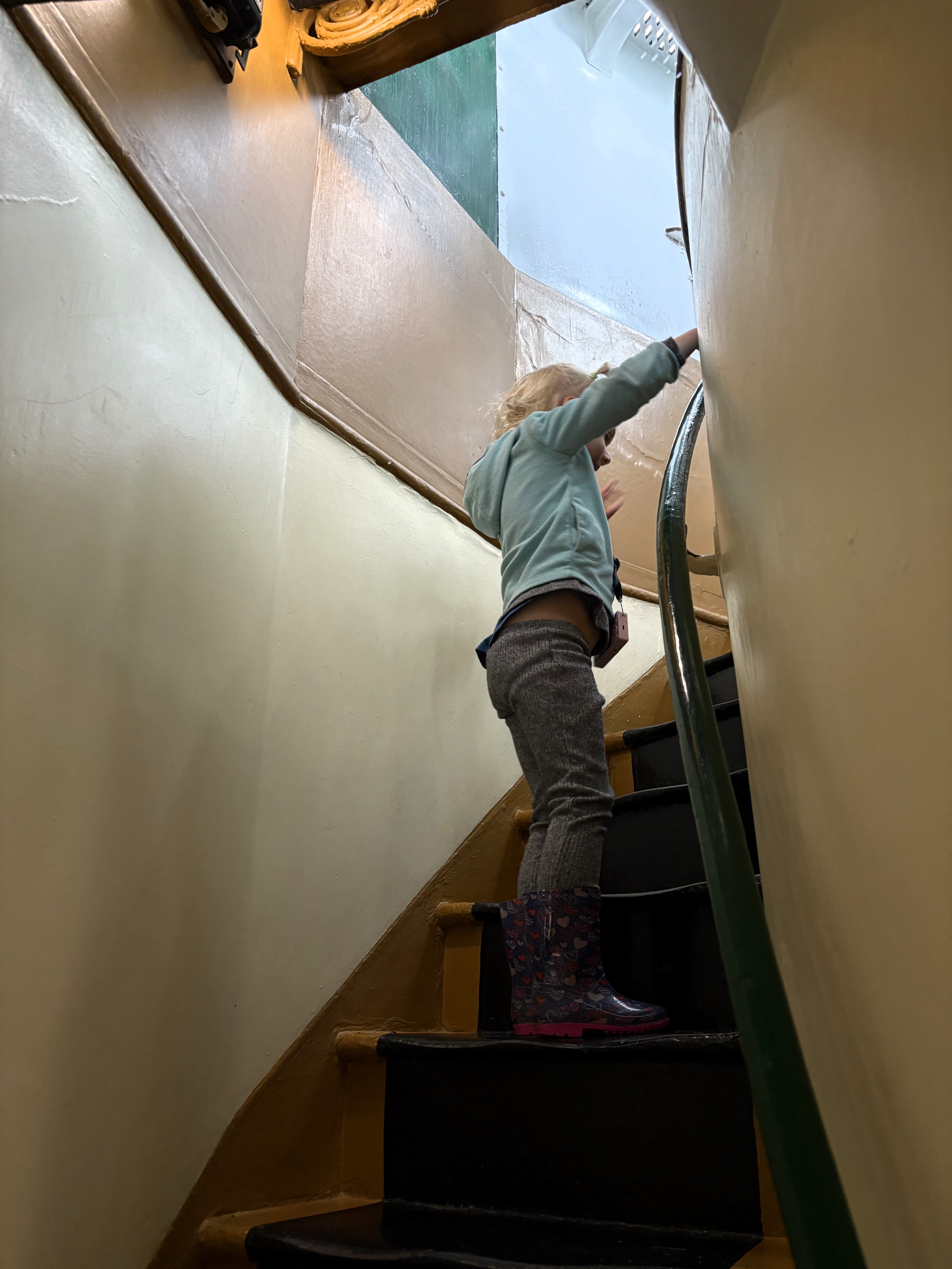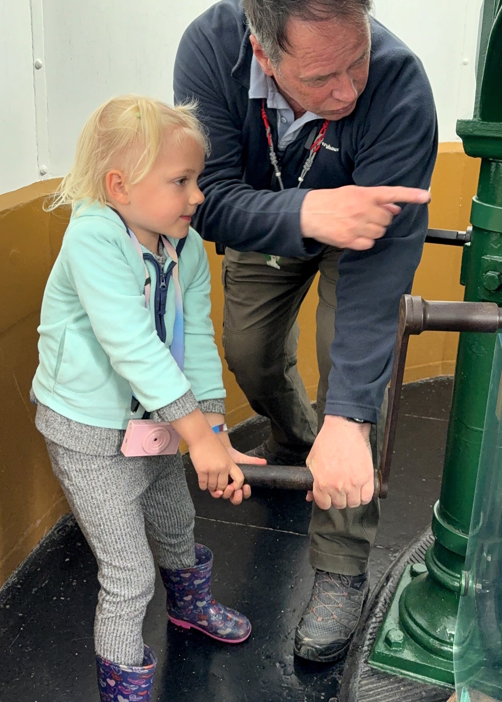 T2 said she was good with this, so we followed Kathy into the lighthouse, where she asked another man if we could have a look. “Have a look?” he said. “Wouldn’t you rather climb to the top? And I think it’s about time to wind the crank and start up the light. Would you like to do that?” She was ear to ear smile, nodding her head!